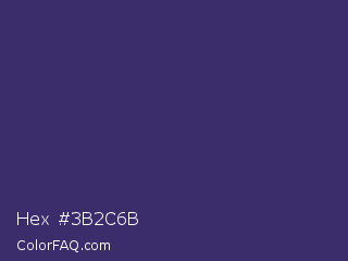 Hex #3b2c6b Color is a dark indigo color and the nearest color is Jacarta #3a2a6a. Hex code #3b2c6b and RGB value is rgb(59,44,107). In RGB color space, this color is composed of 23% red, 17% green, 42% blue, In CMYK color space, this color is composed of 45% cyan, 59% magenta, 0% yellow , 58% black , In HSL color space, this color has a hue angle of 254° , 42% saturation and 30% lightness.