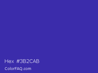 Hex #3b2cab Color is a normal indigo color and the nearest color is Blue Pigment #333399. Hex code #3b2cab and RGB value is rgb(59,44,171). In RGB color space, this color is composed of 23% red, 17% green, 67% blue, In CMYK color space, this color is composed of 65% cyan, 74% magenta, 0% yellow , 33% black , In HSL color space, this color has a hue angle of 247° , 59% saturation and 42% lightness.