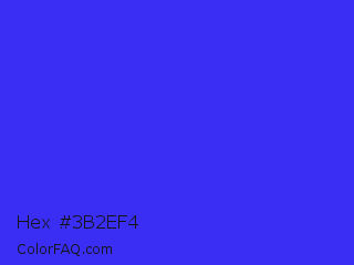 Hex #3b2ef4 Color is a normal indigo color and the nearest color is Palatinate Blue #273be2. Hex code #3b2ef4 and RGB value is rgb(59,46,244). In RGB color space, this color is composed of 23% red, 18% green, 96% blue, In CMYK color space, this color is composed of 76% cyan, 81% magenta, 0% yellow , 4% black , In HSL color space, this color has a hue angle of 244° , 90% saturation and 57% lightness.