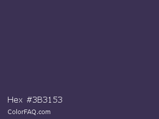 Hex #3b3153 Color is a dark indigo color and the nearest color is Martinique #363050. Hex code #3b3153 and RGB value is rgb(59,49,83). In RGB color space, this color is composed of 23% red, 19% green, 33% blue, In CMYK color space, this color is composed of 29% cyan, 41% magenta, 0% yellow , 67% black , In HSL color space, this color has a hue angle of 258° , 26% saturation and 26% lightness.