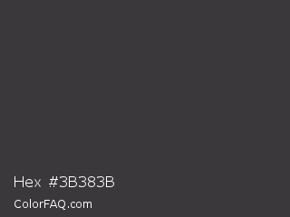 Hex #3b383b Color is a dark magenta color and the nearest color is Onyx #353839. Hex code #3b383b and RGB value is rgb(59,56,59). In RGB color space, this color is composed of 23% red, 22% green, 23% blue, In CMYK color space, this color is composed of 0% cyan, 5% magenta, 0% yellow , 77% black , In HSL color space, this color has a hue angle of 300° , 3% saturation and 23% lightness.