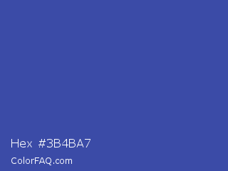 Hex #3b4ba7 Color is a normal blue color and the nearest color is Violet Blue #324ab2. Hex code #3b4ba7 and RGB value is rgb(59,75,167). In RGB color space, this color is composed of 23% red, 29% green, 65% blue, In CMYK color space, this color is composed of 65% cyan, 55% magenta, 0% yellow , 35% black , In HSL color space, this color has a hue angle of 231° , 48% saturation and 44% lightness.