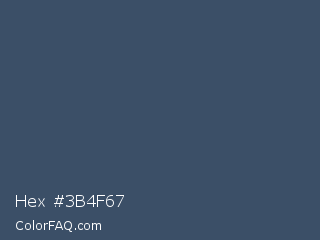 Hex #3b4f67 Color is a normal blue color and the nearest color is Fiord #405169. Hex code #3b4f67 and RGB value is rgb(59,79,103). In RGB color space, this color is composed of 23% red, 31% green, 40% blue, In CMYK color space, this color is composed of 43% cyan, 23% magenta, 0% yellow , 60% black , In HSL color space, this color has a hue angle of 213° , 27% saturation and 32% lightness.