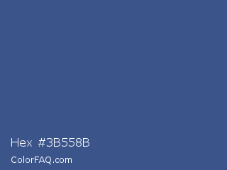 Hex #3b558b Color is a normal blue color and the nearest color is Chambray #354e8c. Hex code #3b558b and RGB value is rgb(59,85,139). In RGB color space, this color is composed of 23% red, 33% green, 55% blue, In CMYK color space, this color is composed of 58% cyan, 39% magenta, 0% yellow , 45% black , In HSL color space, this color has a hue angle of 221° , 40% saturation and 39% lightness.