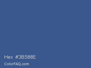 Hex #3b588e Color is a normal blue color and the nearest color is Chambray #354e8c. Hex code #3b588e and RGB value is rgb(59,88,142). In RGB color space, this color is composed of 23% red, 35% green, 56% blue, In CMYK color space, this color is composed of 58% cyan, 38% magenta, 0% yellow , 44% black , In HSL color space, this color has a hue angle of 219° , 41% saturation and 39% lightness.
