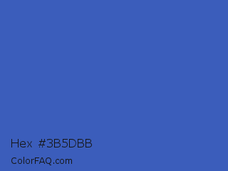 Hex #3b5dbb Color is a normal blue color and the nearest color is Cerulean Blue #2a52be. Hex code #3b5dbb and RGB value is rgb(59,93,187). In RGB color space, this color is composed of 23% red, 36% green, 73% blue, In CMYK color space, this color is composed of 68% cyan, 50% magenta, 0% yellow , 27% black , In HSL color space, this color has a hue angle of 224° , 52% saturation and 48% lightness.