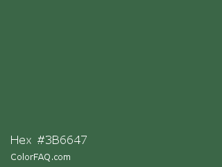 Hex #3b6647 Color is a normal green color and the nearest color is Killarney #3a6a47. Hex code #3b6647 and RGB value is rgb(59,102,71). In RGB color space, this color is composed of 23% red, 40% green, 28% blue, In CMYK color space, this color is composed of 42% cyan, 0% magenta, 30% yellow , 60% black , In HSL color space, this color has a hue angle of 137° , 27% saturation and 32% lightness.