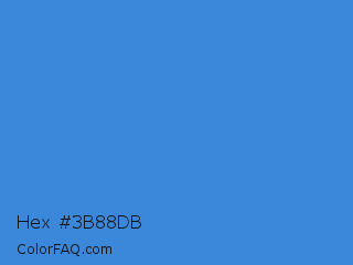 Hex #3b88db Color is a normal blue color and the nearest color is Tufts Blue #3e8ede. Hex code #3b88db and RGB value is rgb(59,136,219). In RGB color space, this color is composed of 23% red, 53% green, 86% blue, In CMYK color space, this color is composed of 73% cyan, 38% magenta, 0% yellow , 14% black , In HSL color space, this color has a hue angle of 211° , 69% saturation and 55% lightness.