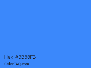 Hex #3b88fb Color is a light blue color and the nearest color is Brilliant Azure #3399ff. Hex code #3b88fb and RGB value is rgb(59,136,251). In RGB color space, this color is composed of 23% red, 53% green, 98% blue, In CMYK color space, this color is composed of 76% cyan, 46% magenta, 0% yellow , 2% black , In HSL color space, this color has a hue angle of 216° , 96% saturation and 61% lightness.