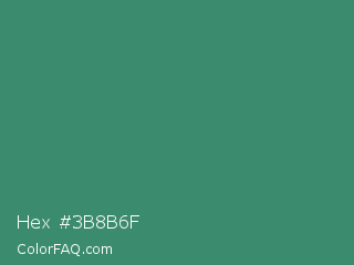 Hex #3b8b6f Color is a normal green color and the nearest color is Viridian #40826d. Hex code #3b8b6f and RGB value is rgb(59,139,111). In RGB color space, this color is composed of 23% red, 55% green, 44% blue, In CMYK color space, this color is composed of 58% cyan, 0% magenta, 20% yellow , 45% black , In HSL color space, this color has a hue angle of 159° , 40% saturation and 39% lightness.