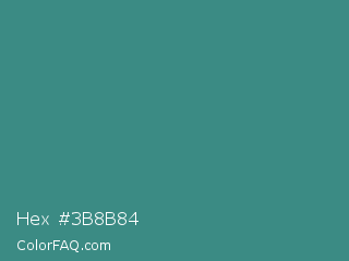 Hex #3b8b84 Color is a normal cyan color and the nearest color is Lochinvar #2c8c84. Hex code #3b8b84 and RGB value is rgb(59,139,132). In RGB color space, this color is composed of 23% red, 55% green, 52% blue, In CMYK color space, this color is composed of 58% cyan, 0% magenta, 5% yellow , 45% black , In HSL color space, this color has a hue angle of 175° , 40% saturation and 39% lightness.