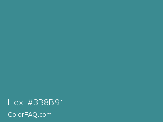 Hex #3b8b91 Color is a normal cyan color and the nearest color is Lochinvar #2c8c84. Hex code #3b8b91 and RGB value is rgb(59,139,145). In RGB color space, this color is composed of 23% red, 55% green, 57% blue, In CMYK color space, this color is composed of 59% cyan, 4% magenta, 0% yellow , 43% black , In HSL color space, this color has a hue angle of 184° , 42% saturation and 40% lightness.