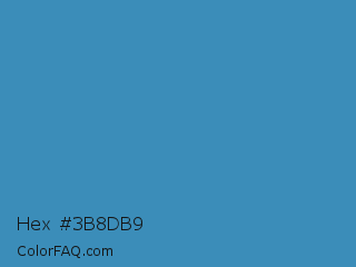 Hex #3b8db9 Color is a normal blue color and the nearest color is Boston Blue #3b91b4. Hex code #3b8db9 and RGB value is rgb(59,141,185). In RGB color space, this color is composed of 23% red, 55% green, 73% blue, In CMYK color space, this color is composed of 68% cyan, 24% magenta, 0% yellow , 27% black , In HSL color space, this color has a hue angle of 201° , 52% saturation and 48% lightness.