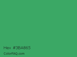 Hex #3ba865 Color is a normal green color and the nearest color is Chateau Green #40a860. Hex code #3ba865 and RGB value is rgb(59,168,101). In RGB color space, this color is composed of 23% red, 66% green, 40% blue, In CMYK color space, this color is composed of 65% cyan, 0% magenta, 40% yellow , 34% black , In HSL color space, this color has a hue angle of 143° , 48% saturation and 45% lightness.