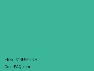 Hex #3bb698 Color is a normal cyan color and the nearest color is Keppel #3ab09e. Hex code #3bb698 and RGB value is rgb(59,182,152). In RGB color space, this color is composed of 23% red, 71% green, 60% blue, In CMYK color space, this color is composed of 68% cyan, 0% magenta, 16% yellow , 29% black , In HSL color space, this color has a hue angle of 165° , 51% saturation and 47% lightness.