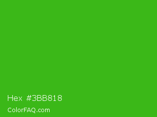 Hex #3bb818 Color is a normal green color and the nearest color is Kelly Green #4cbb17. Hex code #3bb818 and RGB value is rgb(59,184,24). In RGB color space, this color is composed of 23% red, 72% green, 9% blue, In CMYK color space, this color is composed of 68% cyan, 0% magenta, 87% yellow , 28% black , In HSL color space, this color has a hue angle of 107° , 77% saturation and 41% lightness.