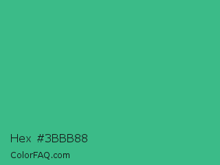 Hex #3bbb88 Color is a normal green color and the nearest color is Mint #3eb489. Hex code #3bbb88 and RGB value is rgb(59,187,136). In RGB color space, this color is composed of 23% red, 73% green, 53% blue, In CMYK color space, this color is composed of 68% cyan, 0% magenta, 27% yellow , 27% black , In HSL color space, this color has a hue angle of 156° , 52% saturation and 48% lightness.
