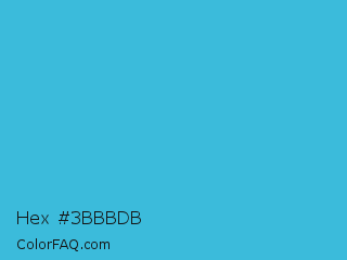 Hex #3bbbdb Color is a normal cyan color and the nearest color is Scooter #2ebfd4. Hex code #3bbbdb and RGB value is rgb(59,187,219). In RGB color space, this color is composed of 23% red, 73% green, 86% blue, In CMYK color space, this color is composed of 73% cyan, 15% magenta, 0% yellow , 14% black , In HSL color space, this color has a hue angle of 192° , 69% saturation and 55% lightness.