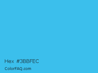 Hex #3bbfec Color is a normal blue color and the nearest color is Picton Blue #45b1e8. Hex code #3bbfec and RGB value is rgb(59,191,236). In RGB color space, this color is composed of 23% red, 75% green, 93% blue, In CMYK color space, this color is composed of 75% cyan, 19% magenta, 0% yellow , 7% black , In HSL color space, this color has a hue angle of 195° , 82% saturation and 58% lightness.