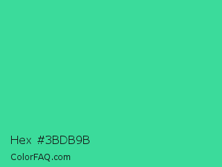 Hex #3bdb9b Color is a normal green color and the nearest color is Eucalyptus #44d7a8. Hex code #3bdb9b and RGB value is rgb(59,219,155). In RGB color space, this color is composed of 23% red, 86% green, 61% blue, In CMYK color space, this color is composed of 73% cyan, 0% magenta, 29% yellow , 14% black , In HSL color space, this color has a hue angle of 156° , 69% saturation and 55% lightness.
