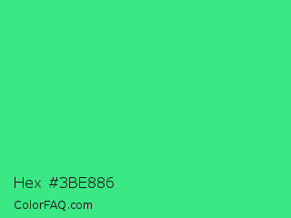 Hex #3be886 Color is a normal green color and the nearest color is UFO Green #3cd070. Hex code #3be886 and RGB value is rgb(59,232,134). In RGB color space, this color is composed of 23% red, 91% green, 53% blue, In CMYK color space, this color is composed of 75% cyan, 0% magenta, 42% yellow , 9% black , In HSL color space, this color has a hue angle of 146° , 79% saturation and 57% lightness.
