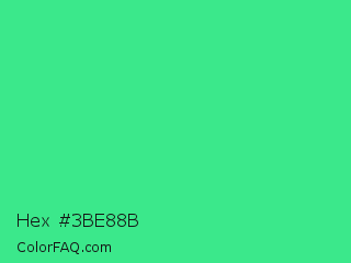 Hex #3be88b Color is a normal green color and the nearest color is Shamrock #33cc99. Hex code #3be88b and RGB value is rgb(59,232,139). In RGB color space, this color is composed of 23% red, 91% green, 55% blue, In CMYK color space, this color is composed of 75% cyan, 0% magenta, 40% yellow , 9% black , In HSL color space, this color has a hue angle of 148° , 79% saturation and 57% lightness.