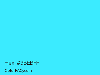 Hex #3bebff Color is a light cyan color and the nearest color is Loeen #15f2fd. Hex code #3bebff and RGB value is rgb(59,235,255). In RGB color space, this color is composed of 23% red, 92% green, 100% blue, In CMYK color space, this color is composed of 77% cyan, 8% magenta, 0% yellow , 0% black , In HSL color space, this color has a hue angle of 186° , 100% saturation and 62% lightness.