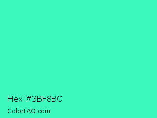 Hex #3bf8bc Color is a normal green color and the nearest color is Turquoise #40e0d0. Hex code #3bf8bc and RGB value is rgb(59,248,188). In RGB color space, this color is composed of 23% red, 97% green, 74% blue, In CMYK color space, this color is composed of 76% cyan, 0% magenta, 24% yellow , 3% black , In HSL color space, this color has a hue angle of 161° , 93% saturation and 60% lightness.