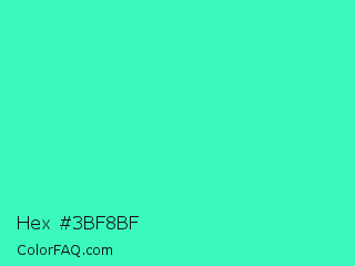 Hex #3bf8bf Color is a normal green color and the nearest color is Turquoise #40e0d0. Hex code #3bf8bf and RGB value is rgb(59,248,191). In RGB color space, this color is composed of 23% red, 97% green, 75% blue, In CMYK color space, this color is composed of 76% cyan, 0% magenta, 23% yellow , 3% black , In HSL color space, this color has a hue angle of 162° , 93% saturation and 60% lightness.