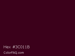 Hex #3c011b Color is a very dark rose color and the nearest color is Toledo #3a0020. Hex code #3c011b and RGB value is rgb(60,1,27). In RGB color space, this color is composed of 24% red, 0% green, 11% blue, In CMYK color space, this color is composed of 0% cyan, 98% magenta, 55% yellow , 76% black , In HSL color space, this color has a hue angle of 334° , 97% saturation and 12% lightness.