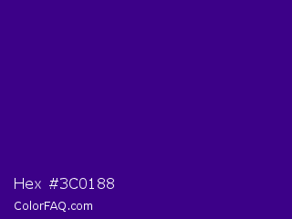Hex #3c0188 Color is a dark violet color and the nearest color is Kingfisher Daisy #3e0480. Hex code #3c0188 and RGB value is rgb(60,1,136). In RGB color space, this color is composed of 24% red, 0% green, 53% blue, In CMYK color space, this color is composed of 56% cyan, 99% magenta, 0% yellow , 47% black , In HSL color space, this color has a hue angle of 266° , 99% saturation and 27% lightness.
