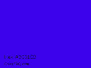 Hex #3c01eb Color is a normal indigo color and the nearest color is Electric Ultramarine #3f00ff. Hex code #3c01eb and RGB value is rgb(60,1,235). In RGB color space, this color is composed of 24% red, 0% green, 92% blue, In CMYK color space, this color is composed of 74% cyan, 100% magenta, 0% yellow , 8% black , In HSL color space, this color has a hue angle of 255° , 99% saturation and 46% lightness.
