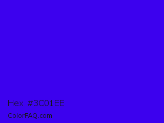 Hex #3c01ee Color is a normal indigo color and the nearest color is Electric Ultramarine #3f00ff. Hex code #3c01ee and RGB value is rgb(60,1,238). In RGB color space, this color is composed of 24% red, 0% green, 93% blue, In CMYK color space, this color is composed of 75% cyan, 100% magenta, 0% yellow , 7% black , In HSL color space, this color has a hue angle of 255° , 99% saturation and 47% lightness.