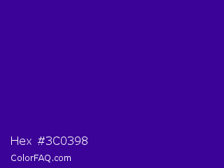 Hex #3c0398 Color is a dark violet color and the nearest color is Blue Gem #2c0e8c. Hex code #3c0398 and RGB value is rgb(60,3,152). In RGB color space, this color is composed of 24% red, 1% green, 60% blue, In CMYK color space, this color is composed of 61% cyan, 98% magenta, 0% yellow , 40% black , In HSL color space, this color has a hue angle of 263° , 96% saturation and 30% lightness.