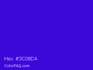 Hex #3c08da Color is a normal indigo color and the nearest color is Interdimensional Blue #360ccc. Hex code #3c08da and RGB value is rgb(60,8,218). In RGB color space, this color is composed of 24% red, 3% green, 85% blue, In CMYK color space, this color is composed of 72% cyan, 96% magenta, 0% yellow , 15% black , In HSL color space, this color has a hue angle of 255° , 93% saturation and 44% lightness.