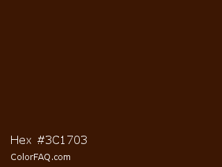 Hex #3c1703 Color is a very dark orange color and the nearest color is Brown Pod #401801. Hex code #3c1703 and RGB value is rgb(60,23,3). In RGB color space, this color is composed of 24% red, 9% green, 1% blue, In CMYK color space, this color is composed of 0% cyan, 62% magenta, 95% yellow , 76% black , In HSL color space, this color has a hue angle of 21° , 90% saturation and 12% lightness.