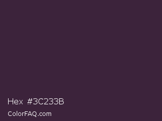 Hex #3c233b Color is a very dark magenta color and the nearest color is Blackcurrant #32293a. Hex code #3c233b and RGB value is rgb(60,35,59). In RGB color space, this color is composed of 24% red, 14% green, 23% blue, In CMYK color space, this color is composed of 0% cyan, 42% magenta, 2% yellow , 76% black , In HSL color space, this color has a hue angle of 302° , 26% saturation and 19% lightness.