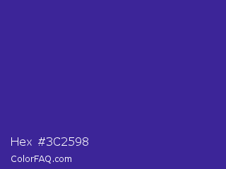 Hex #3c2598 Color is a normal indigo color and the nearest color is Blue Pigment #333399. Hex code #3c2598 and RGB value is rgb(60,37,152). In RGB color space, this color is composed of 24% red, 15% green, 60% blue, In CMYK color space, this color is composed of 61% cyan, 76% magenta, 0% yellow , 40% black , In HSL color space, this color has a hue angle of 252° , 61% saturation and 37% lightness.