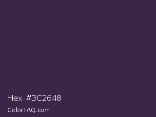 Hex #3c2648 Color is a very dark purple color and the nearest color is Martinique #363050. Hex code #3c2648 and RGB value is rgb(60,38,72). In RGB color space, this color is composed of 24% red, 15% green, 28% blue, In CMYK color space, this color is composed of 17% cyan, 47% magenta, 0% yellow , 72% black , In HSL color space, this color has a hue angle of 279° , 31% saturation and 22% lightness.