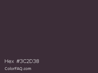 Hex #3c2d38 Color is a very dark magenta color and the nearest color is Dune #383533. Hex code #3c2d38 and RGB value is rgb(60,45,56). In RGB color space, this color is composed of 24% red, 18% green, 22% blue, In CMYK color space, this color is composed of 0% cyan, 25% magenta, 7% yellow , 76% black , In HSL color space, this color has a hue angle of 316° , 14% saturation and 21% lightness.