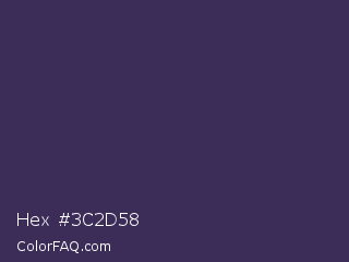 Hex #3c2d58 Color is a dark violet color and the nearest color is Martinique #363050. Hex code #3c2d58 and RGB value is rgb(60,45,88). In RGB color space, this color is composed of 24% red, 18% green, 35% blue, In CMYK color space, this color is composed of 32% cyan, 49% magenta, 0% yellow , 65% black , In HSL color space, this color has a hue angle of 261° , 32% saturation and 26% lightness.