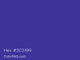 Hex #3c3499 Color is a normal indigo color and the nearest color is Blue Pigment #333399. Hex code #3c3499 and RGB value is rgb(60,52,153). In RGB color space, this color is composed of 24% red, 20% green, 60% blue, In CMYK color space, this color is composed of 61% cyan, 66% magenta, 0% yellow , 40% black , In HSL color space, this color has a hue angle of 245° , 49% saturation and 40% lightness.