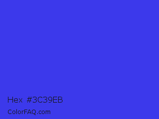 Hex #3c39eb Color is a normal indigo color and the nearest color is Palatinate Blue #273be2. Hex code #3c39eb and RGB value is rgb(60,57,235). In RGB color space, this color is composed of 24% red, 22% green, 92% blue, In CMYK color space, this color is composed of 74% cyan, 76% magenta, 0% yellow , 8% black , In HSL color space, this color has a hue angle of 241° , 82% saturation and 57% lightness.