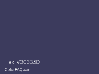Hex #3c3b5d Color is a dark indigo color and the nearest color is Gun Powder #414257. Hex code #3c3b5d and RGB value is rgb(60,59,93). In RGB color space, this color is composed of 24% red, 23% green, 36% blue, In CMYK color space, this color is composed of 35% cyan, 37% magenta, 0% yellow , 64% black , In HSL color space, this color has a hue angle of 242° , 22% saturation and 30% lightness.
