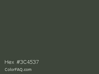 Hex #3c4537 Color is a dark green color and the nearest color is Lunar Green #3c493a. Hex code #3c4537 and RGB value is rgb(60,69,55). In RGB color space, this color is composed of 24% red, 27% green, 22% blue, In CMYK color space, this color is composed of 13% cyan, 0% magenta, 20% yellow , 73% black , In HSL color space, this color has a hue angle of 99° , 11% saturation and 24% lightness.