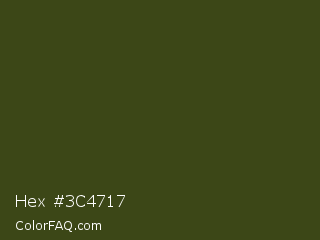 Hex #3c4717 Color is a very dark lime color and the nearest color is Clover #384910. Hex code #3c4717 and RGB value is rgb(60,71,23). In RGB color space, this color is composed of 24% red, 28% green, 9% blue, In CMYK color space, this color is composed of 15% cyan, 0% magenta, 68% yellow , 72% black , In HSL color space, this color has a hue angle of 74° , 51% saturation and 18% lightness.