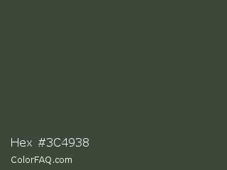 Hex #3c4938 Color is a dark green color and the nearest color is Lunar Green #3c493a. Hex code #3c4938 and RGB value is rgb(60,73,56). In RGB color space, this color is composed of 24% red, 29% green, 22% blue, In CMYK color space, this color is composed of 18% cyan, 0% magenta, 23% yellow , 71% black , In HSL color space, this color has a hue angle of 106° , 13% saturation and 25% lightness.