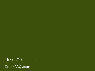 Hex #3c500b Color is a very dark lime color and the nearest color is Clover #384910. Hex code #3c500b and RGB value is rgb(60,80,11). In RGB color space, this color is composed of 24% red, 31% green, 4% blue, In CMYK color space, this color is composed of 25% cyan, 0% magenta, 86% yellow , 69% black , In HSL color space, this color has a hue angle of 77° , 76% saturation and 18% lightness.