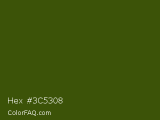 Hex #3c5308 Color is a very dark lime color and the nearest color is Clover #384910. Hex code #3c5308 and RGB value is rgb(60,83,8). In RGB color space, this color is composed of 24% red, 33% green, 3% blue, In CMYK color space, this color is composed of 28% cyan, 0% magenta, 90% yellow , 67% black , In HSL color space, this color has a hue angle of 78° , 82% saturation and 18% lightness.