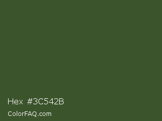 Hex #3c542b Color is a dark green color and the nearest color is Tom Thumb #3f583b. Hex code #3c542b and RGB value is rgb(60,84,43). In RGB color space, this color is composed of 24% red, 33% green, 17% blue, In CMYK color space, this color is composed of 29% cyan, 0% magenta, 49% yellow , 67% black , In HSL color space, this color has a hue angle of 95° , 32% saturation and 25% lightness.